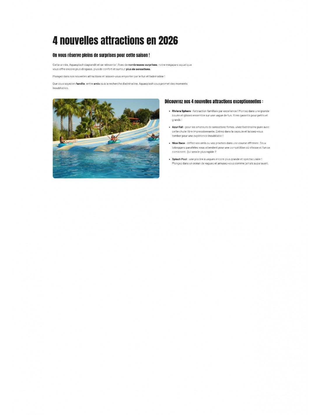 Avec ses 2 000 mètres de glisse et ses 20 000 m2 de superficie, Aquasplash est le plus grand Parc Aquatique de la Côte d'Azur. Ses toboggans aux lignes droites ou incurvées, son lagon et sa piscine à vagues ont construit sa légende, et chaque année, ses pistes bleues créent l’événement. Pour vous rafraîchir, pour vous délasser ou pour vous défouler… c'est ici que ça se passe !